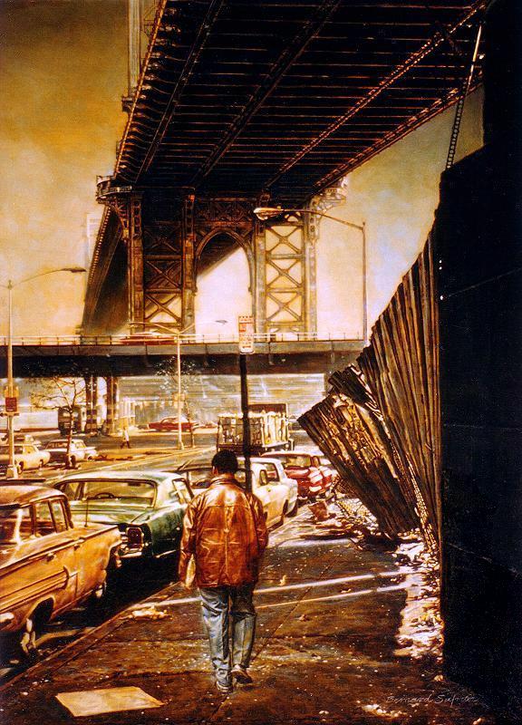 The Manhattan Bridge197017" x 24", oil on masonite large view This painting is hard to reproduce because it is so atmospheric and contains subtle light and color. The ethereal, yet massive structure of the bridge soars over the pedestrian and the somewhat shabby walk below. |