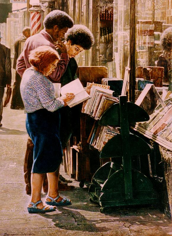 Browsing197023" x 32", oil on masonite large view This bookshop was located on lower 4th Avenue and soon after disappeared because of development. The brilliant sunshine lights up the figures, and creates a very upbeat image. |