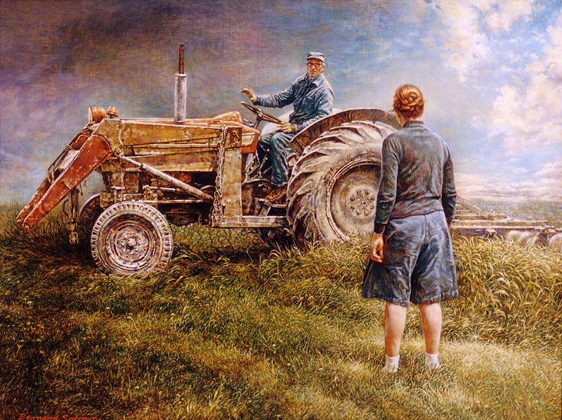 Discing the Garden198024" x 31", oil on masonite large view Safran shows his brother-in-law and wife having a chat prior to discing the Safrans' vegetable garden. The picture captures the air and light of the scene, and shows the artist's interest in the old tractor. |