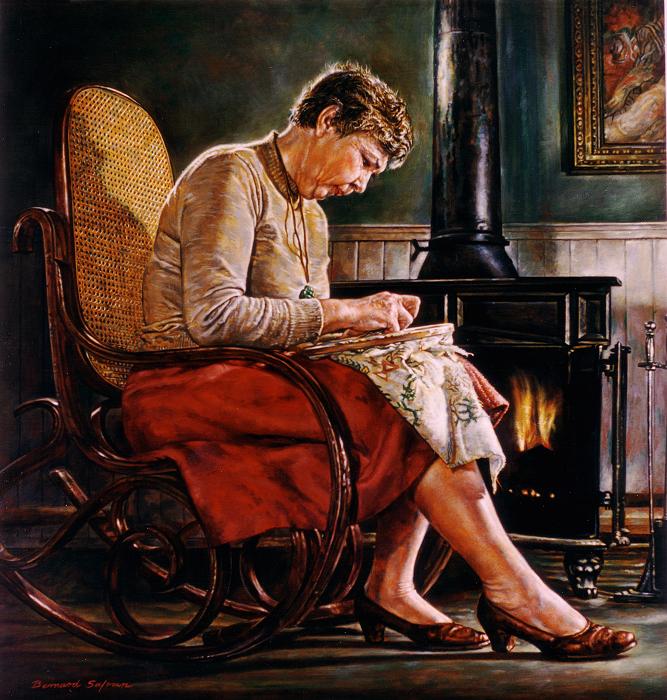 Embroidering198333" x 35", oil on masonite large view The painting depicts Safran's wife Adele embroidering by the woodstove in their kitchen in Jolicure. The old farmhouse was very cold in the winter, and much of the family life centered around the stove where there was some warmth. |