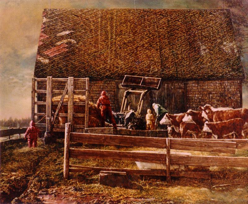 Feeding the Cattle197633" x 40", oil on masonite large view This is a good example of how Safran's use of color became warmer and richer after moving to the country. The scene was one from the artist's backyard, where a neighboring farm family kept some of their cattle one winter. |