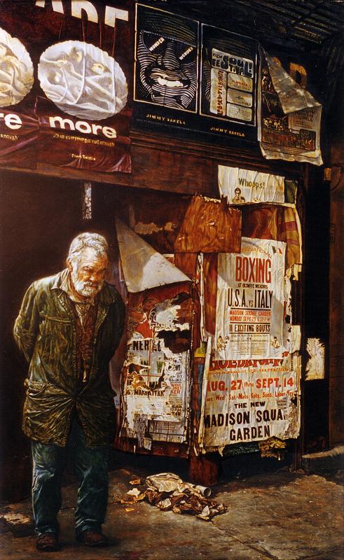The Fighter196930" x 48", oil on masonite large view When Safran saw this man he thought he looked like an old prizefighter. He placed the man in front of a decayed building covered in ragged posters to suggest this and to evoke empathy. |