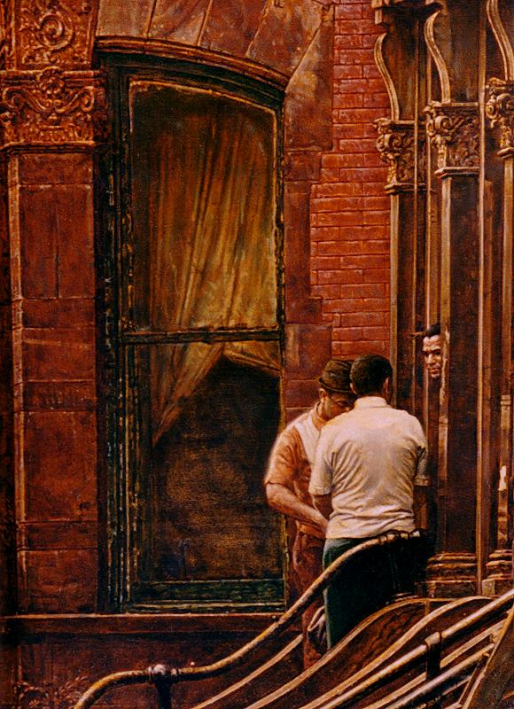 The Fix197118" x 24", oil on masonite large view The complex architecture and iron railings provide a seamy backdrop for the three men, apparently involved in a drug deal. The big dark window invites the viewer to speculate as to what is going on inside. |
