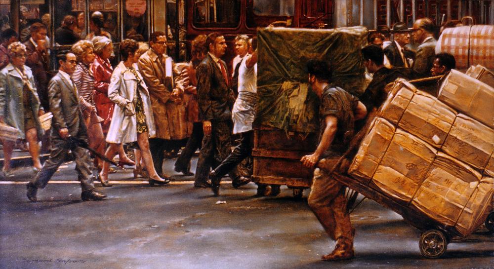In the Garment Center197021" x 37", oil on masonite large view Safran was trying to show the hustle and bustle of the Garment Center at street level. He wanted to show how intense these people are and how closed they are to each other. |