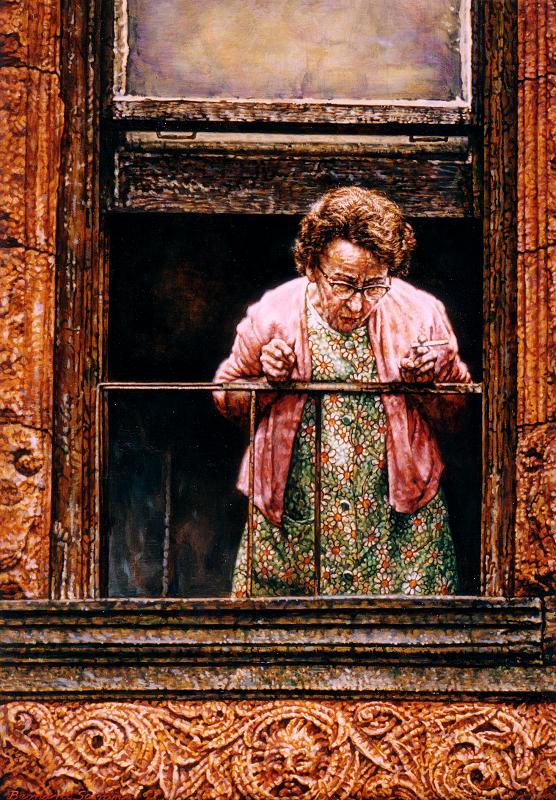 Gossip198620" x 28", oil on masonite large view This painting is one of the last created in the New York series. It is obvious that he enjoyed painting the detail of the old facade and the equally old lady. The painting and its title reflect Safran's good -natured sense of humor. |