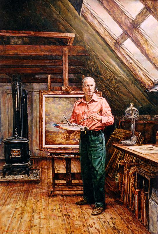 In the Studio198024" x 35", oil on masonite large view Safran painted a number of self portraits over the years, but only two are set in his studio. This one is in his studio in Jolicure, New Brunswick; an unfinished kitchen loft in the old farmhouse in which he lived. He approached painting as a full time job, and would begin each day at 9 AM and end at 5 PM, when he would enjoy a martini and listen to some opera. |