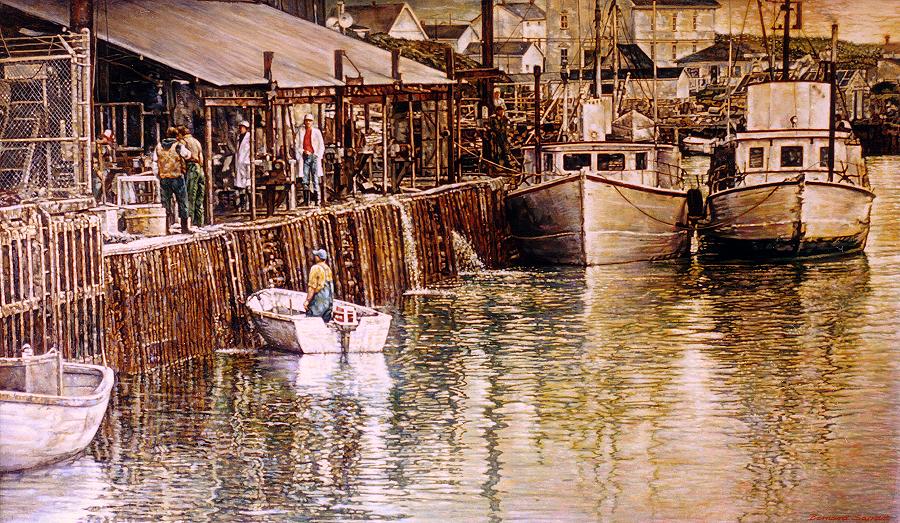 The Inshore Fisherman198127" x 48", oil on masonite large view Safran traveled to Newfoundland in 1981 on a quest to capture images of the rugged seafaring communities there. In this painting, he was obviously fascinated with the play of light on the different textures of the dock, boats, water and town. |