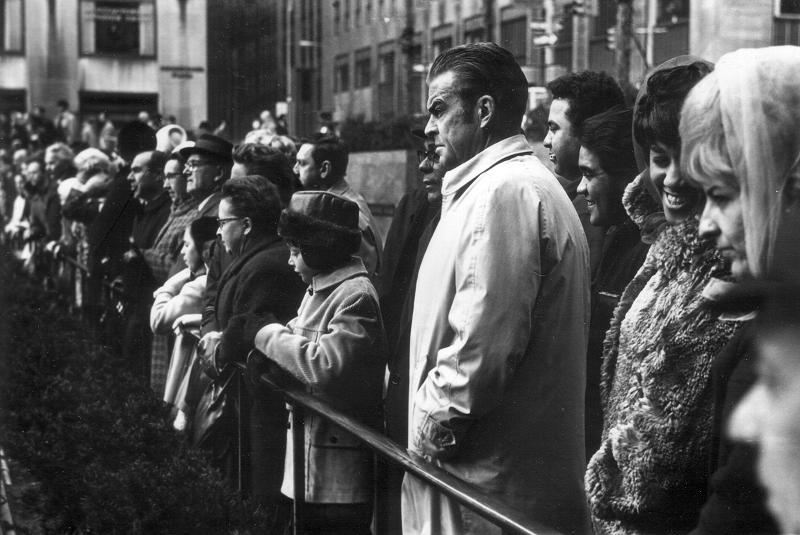 Man in Crowdphotograph printlarge view The man in the foreground stands out among a crowd of happy onlookers (at Rockefeller Center?) with his surly expression. One wonders what is going on in his mind. |