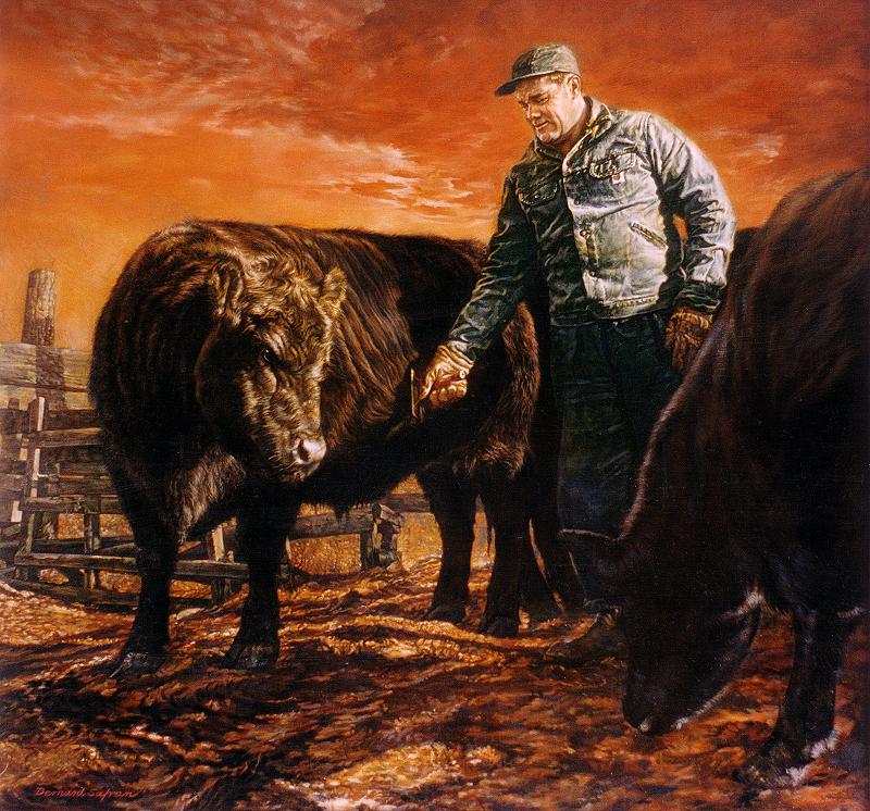 Preparing for the Show197945" x 48", oil on masonite large view In this painting the farmer tentatively grooms the bull for a cattle show. Its is not a typical bucolic scene of country living, but rather a tense moment between animal and man. |