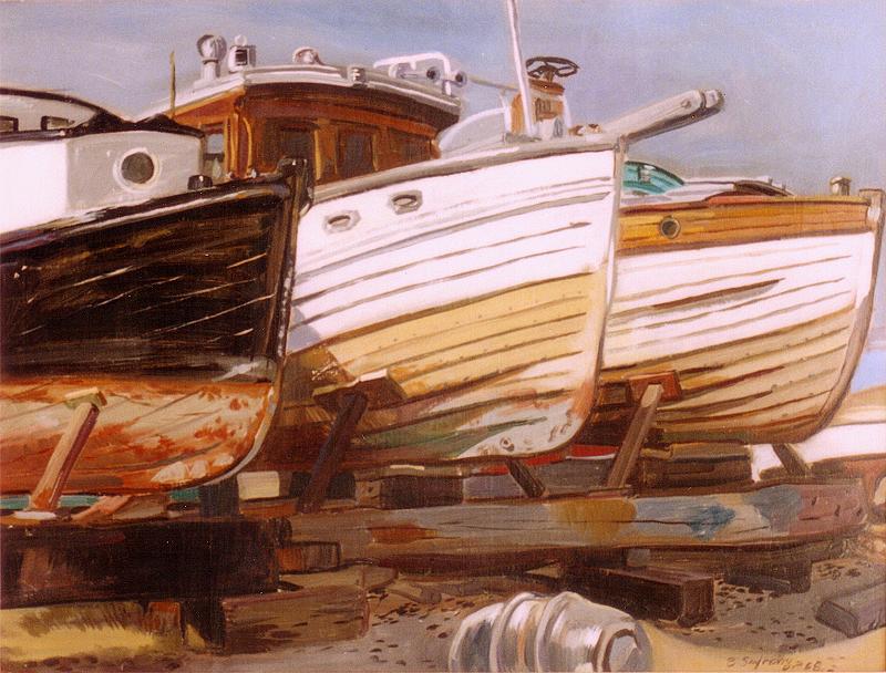 Prows195815" x 20", oil on illustration board large view Beginning in 1956 Safran started to sketch the boatyards, houses and beaches of Rockaway and Jamaica Bay in New York. The idea of painting in the open was to teach him to lay down color quickly and work in a free way under changing circumstances. Painting ex temporare at the beach means often having the wind blow your easel over or spray you and your work with sand and seaweed. |