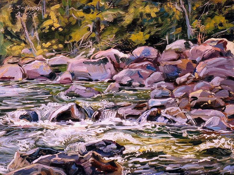 Stream, Lake George15" x 20", oil on illustration boardlarge view Safran sometimes produced oil sketches extemporare -- on the spot, without forethought -- a practice that frees an artist's stroke and sharpens the color sense and eye. He did a series of landscapes during the late 1950s at Lake George and at Rock Tavern, where he and his wife would go to escape the city in the summer. |